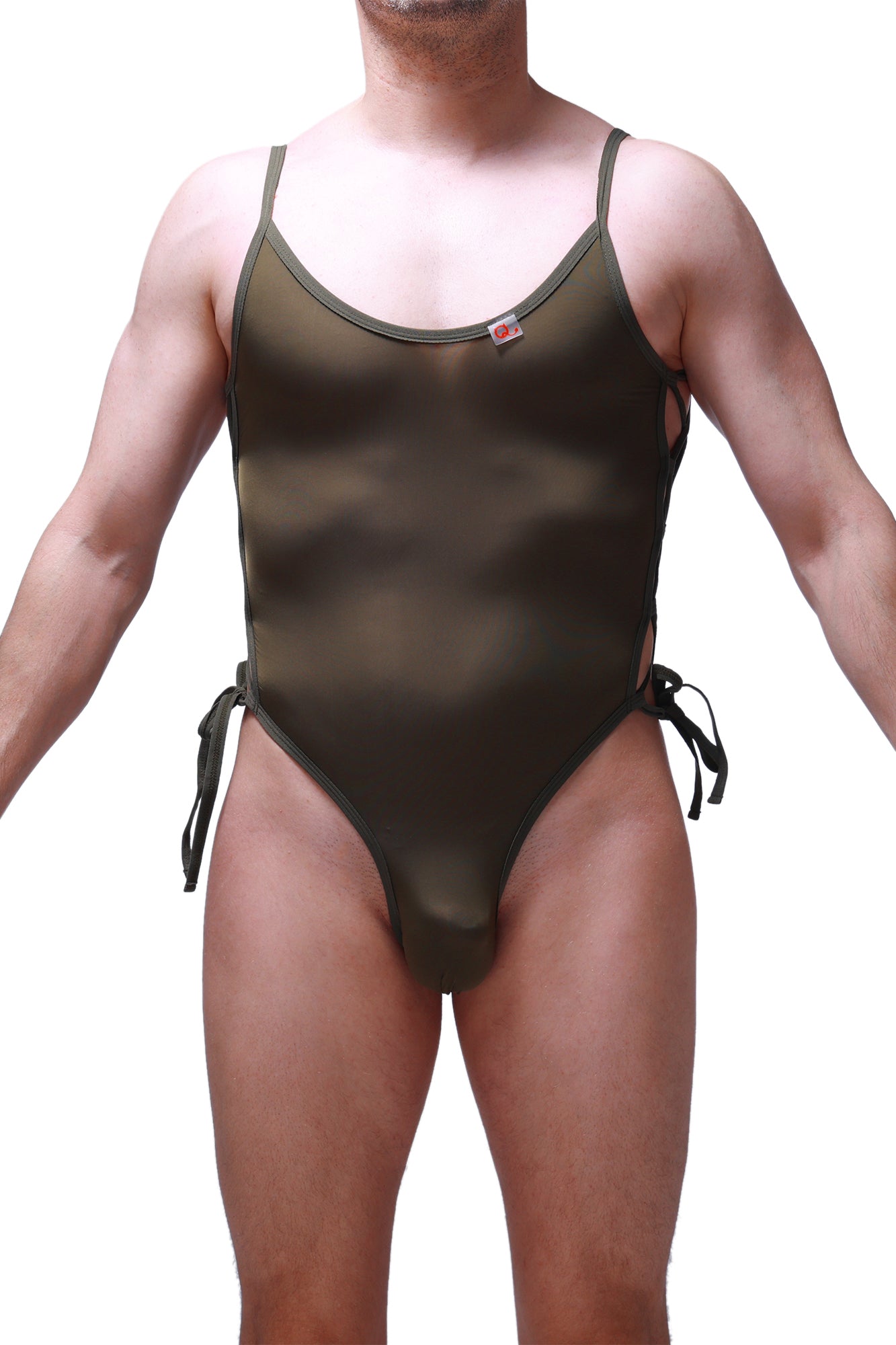Dark green bodysuit in soft and thin nylon like a second skin. Open on the sides with laces.
